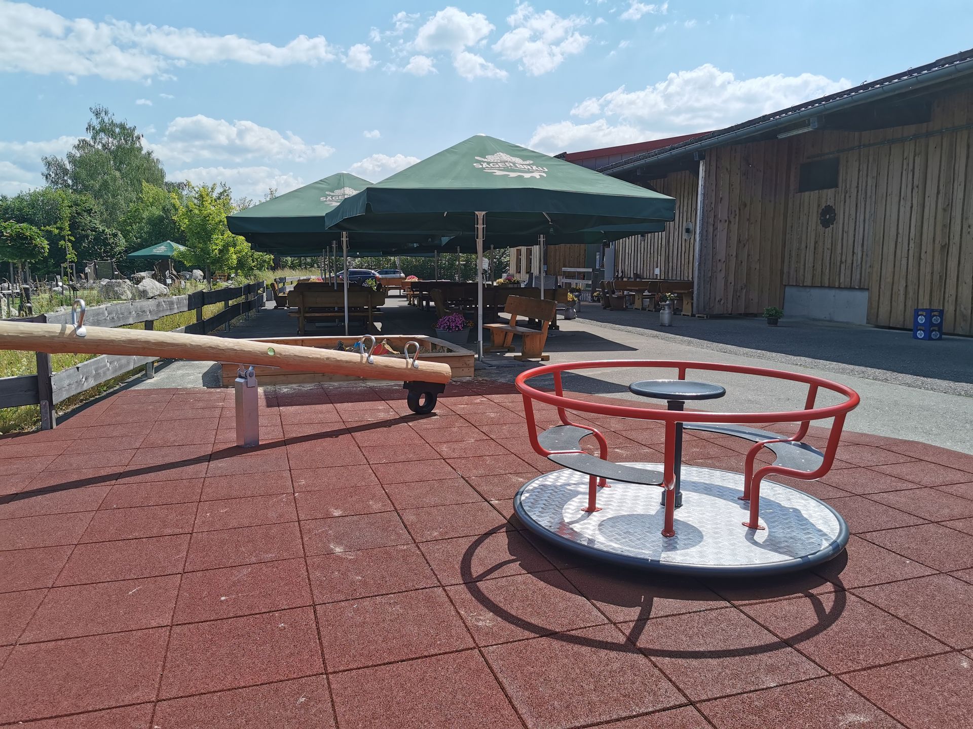 Riesiges Grundstück mit Liegewiese, Spielplatz für die kleinen Gäste mit Sandkasten, Trampolin, Trettraktor, usw. Sie können auch den neuen Spielplatz vorne im Biergarten nutzen.
